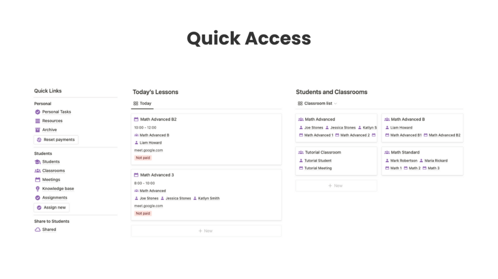 - your students with their own pages, where they can track their meetings, assignments and see all notes, links, videos and articles that you shared with them